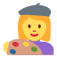 Es una mujer con boina y una paleta de colores. Sirve para expresar creatividad, inspiración o para hablar de proyectos artísticos.